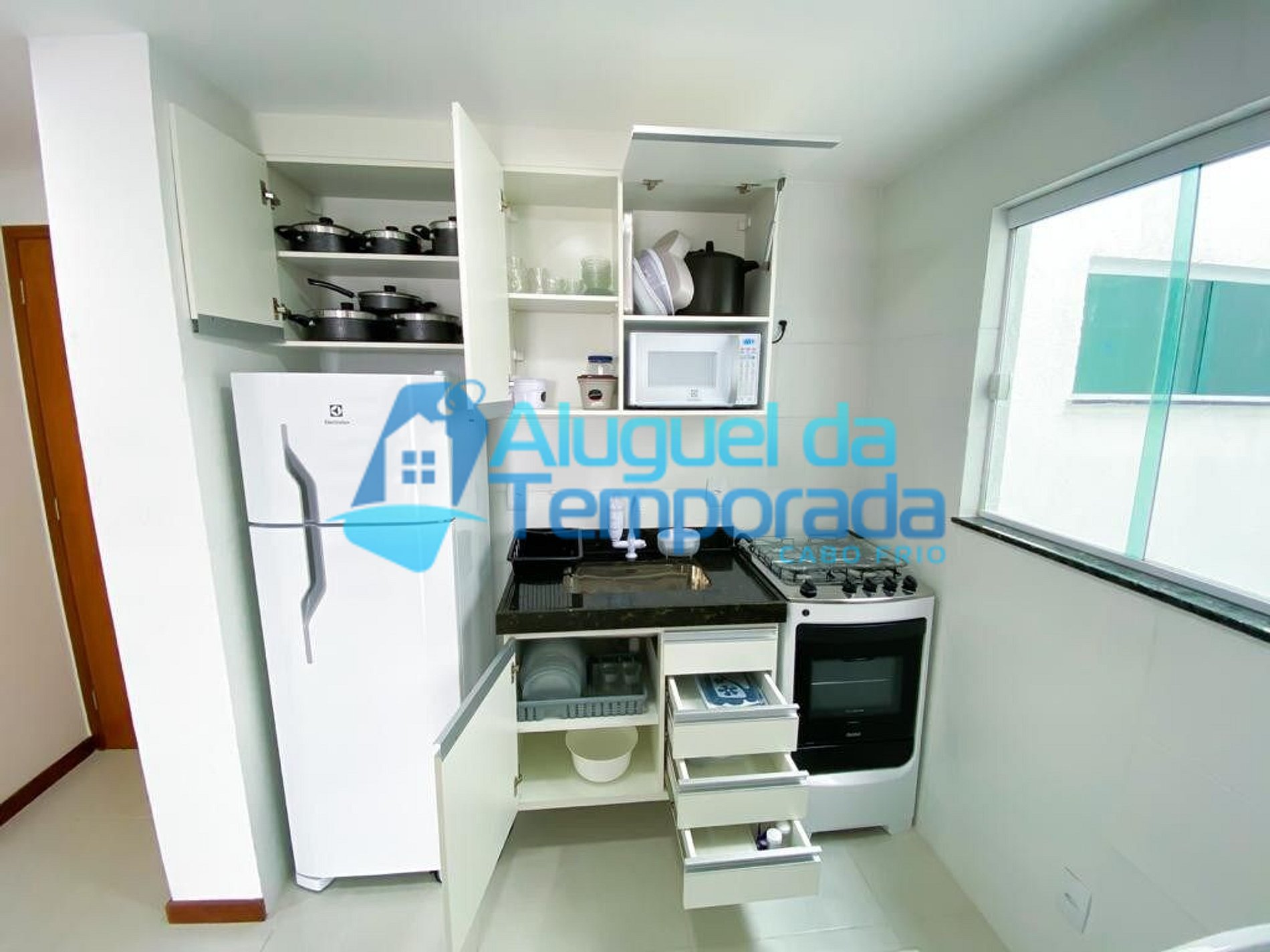 Cozinha (Geladeira, Fogão elétrico, Microondas, Utensílios como talheres, pratos, copos, panelas, panela de pressão)