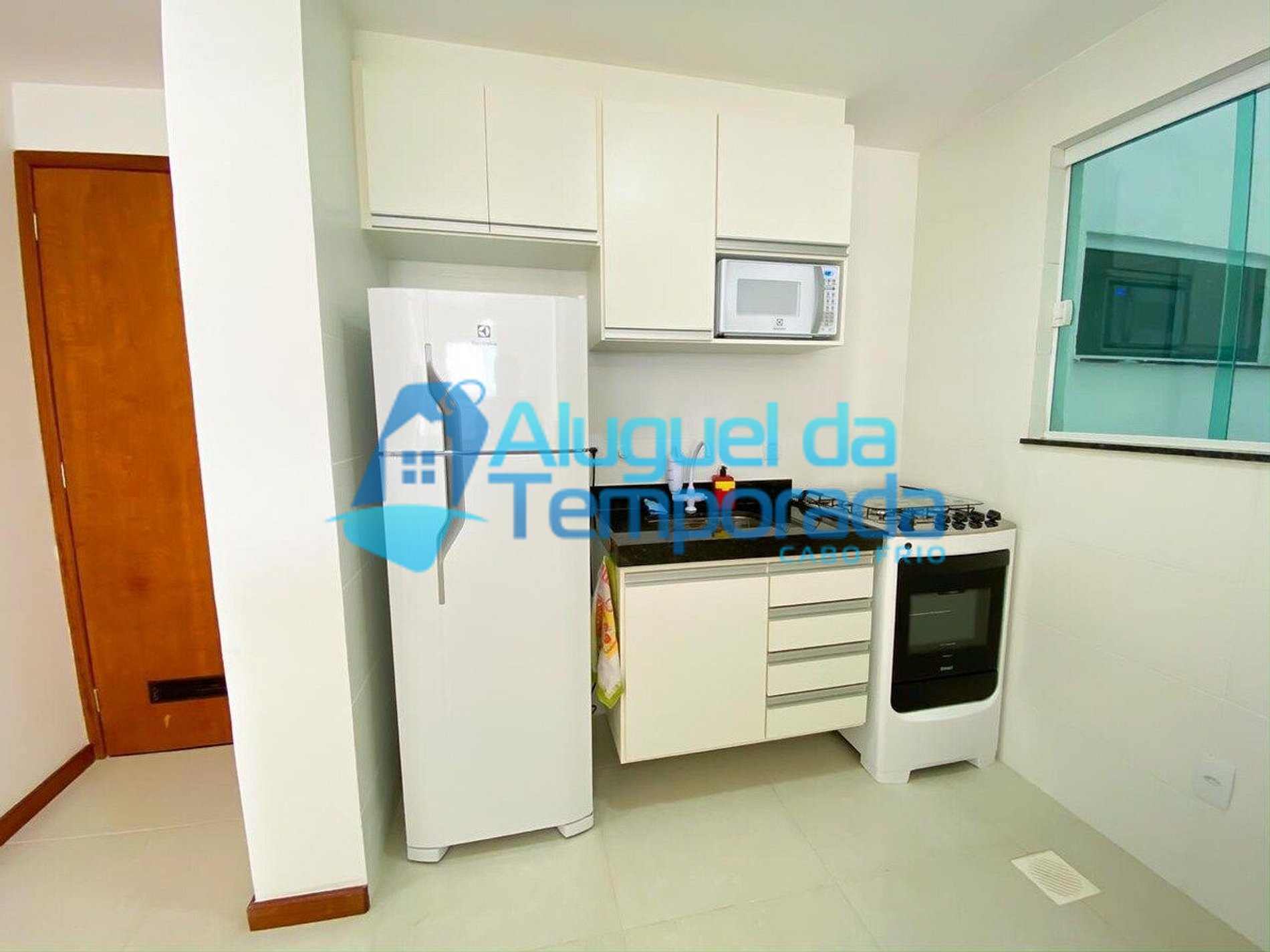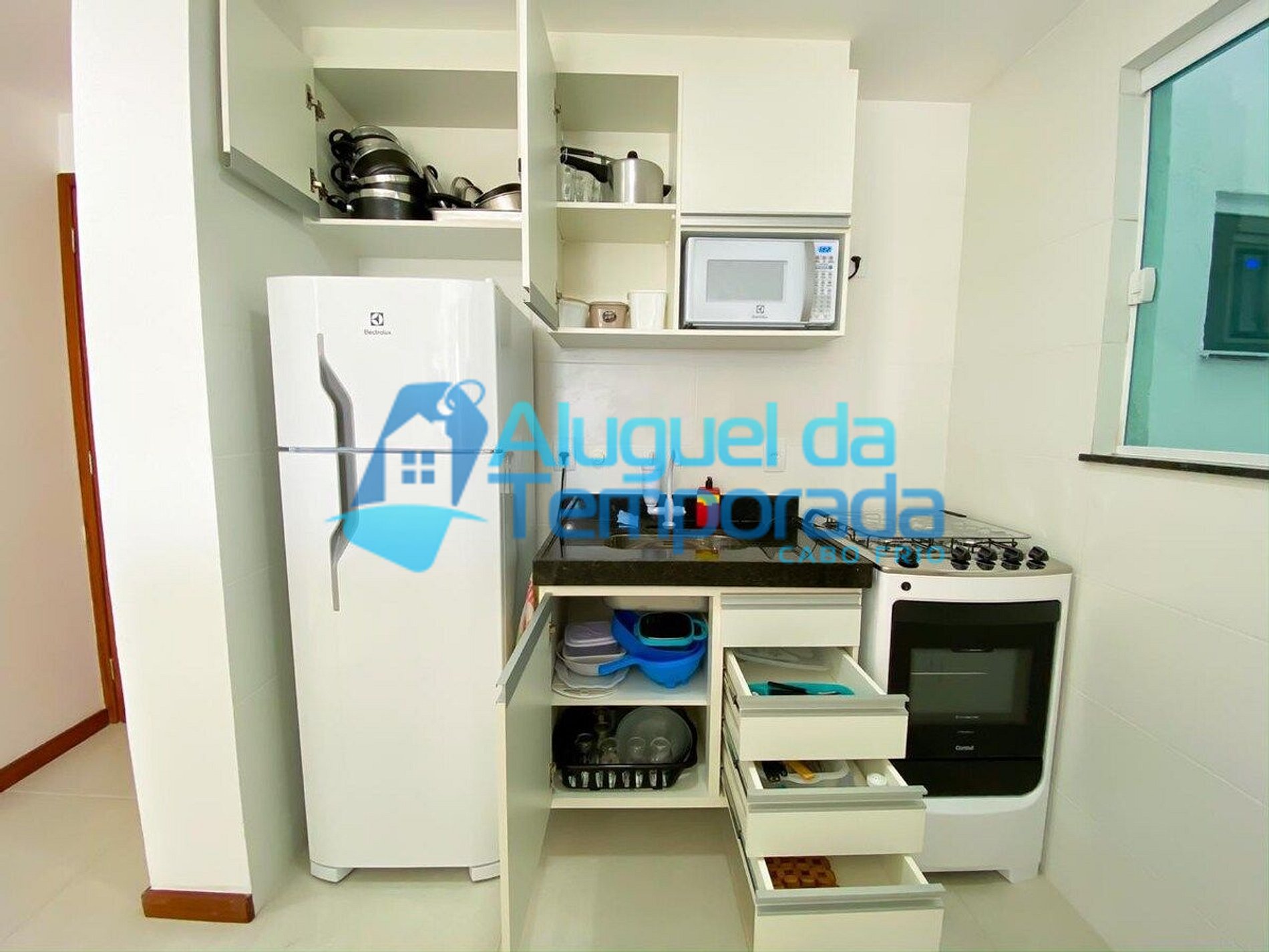 Cozinha Completa (Geladeira, Fogão elétrico, Microondas, Utensílios como louças, talheres, pratos, copos, panelas, panela de pressão)