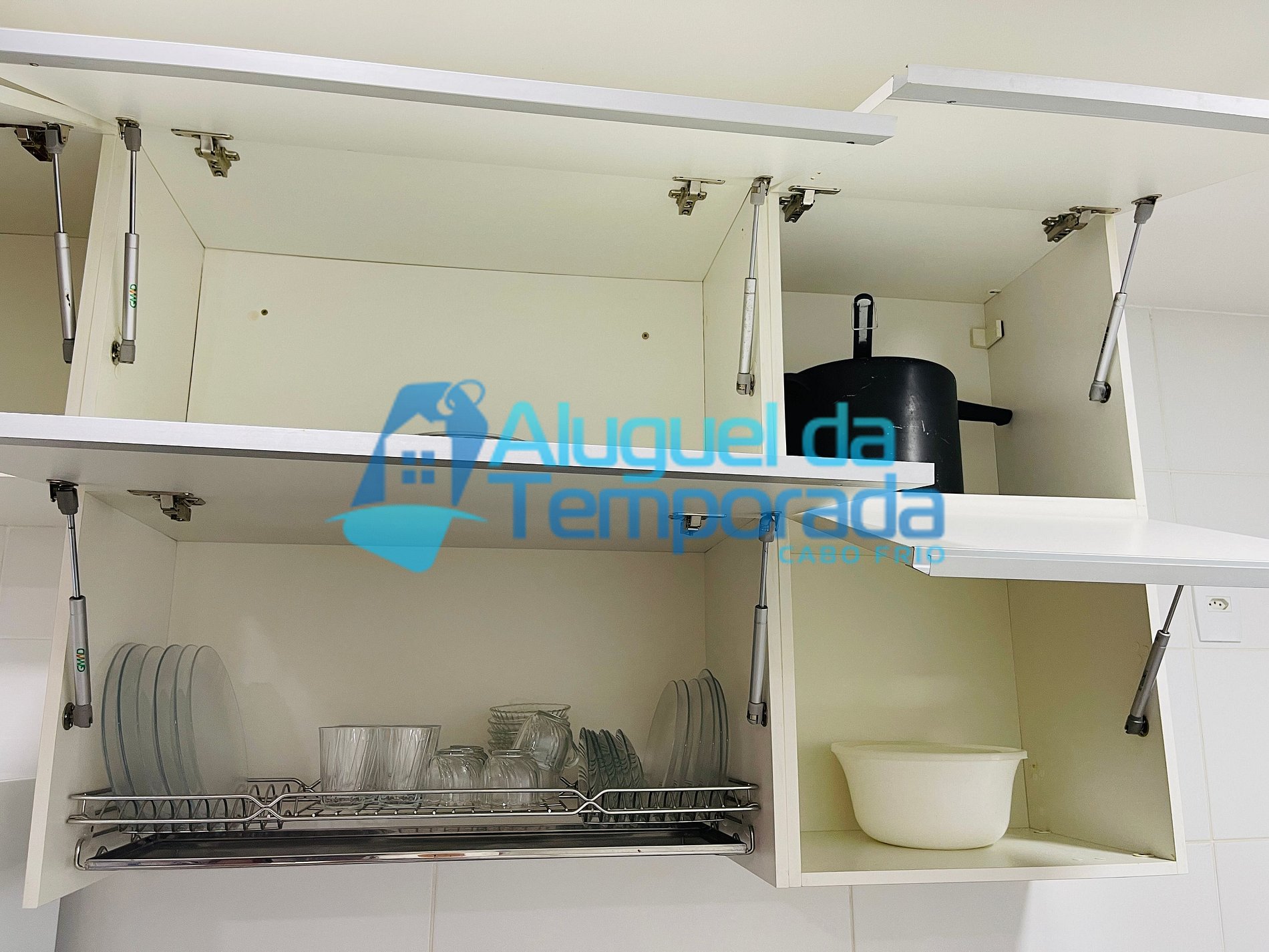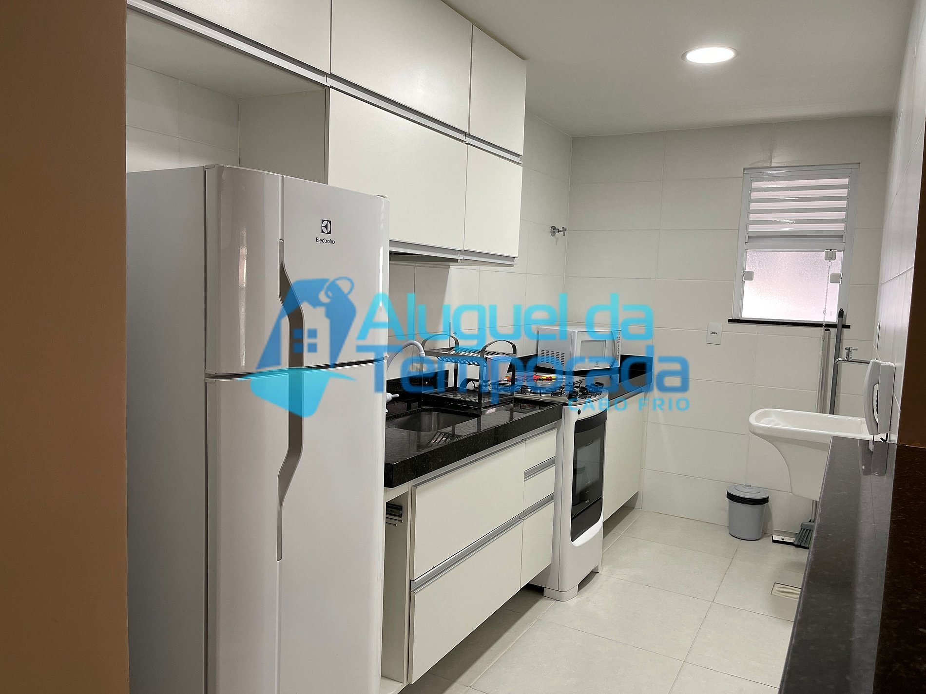 Cozinha Completa (Geladeira, Fogão elétrico, Microondas, Utensílios como louças, talheres, pratos, copos, panelas, panela de pressão)