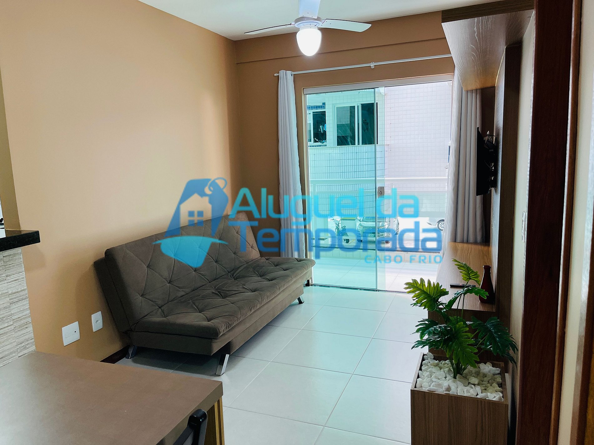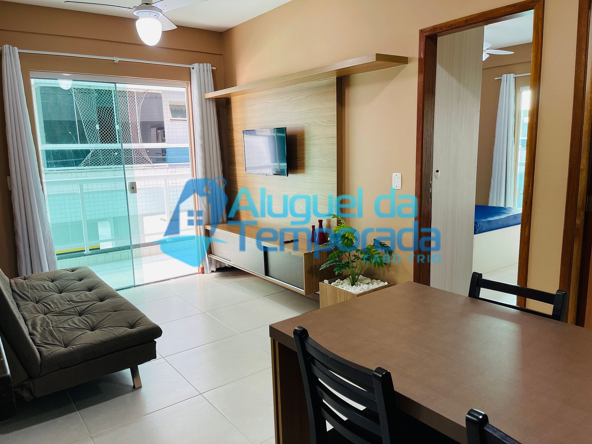 Sala 2 ambientes (sofá-cama, Ventilador de teto, Mesa de jantar com 4 cadeiras, Smart TV)